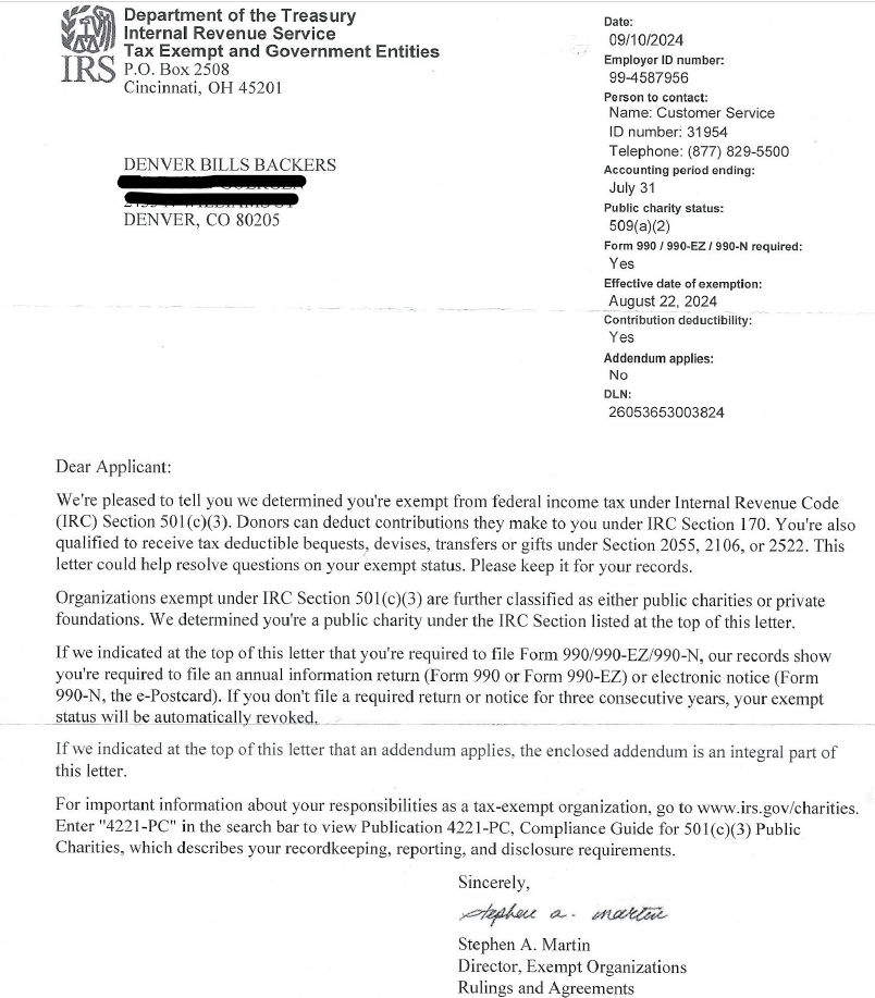 Founded in 2024, our certified 501(c)3 non-profit organization is dedicated to bringing together Buffalo Bills fans to improve the Denver-metro area through charity fundraising and volunteerism.